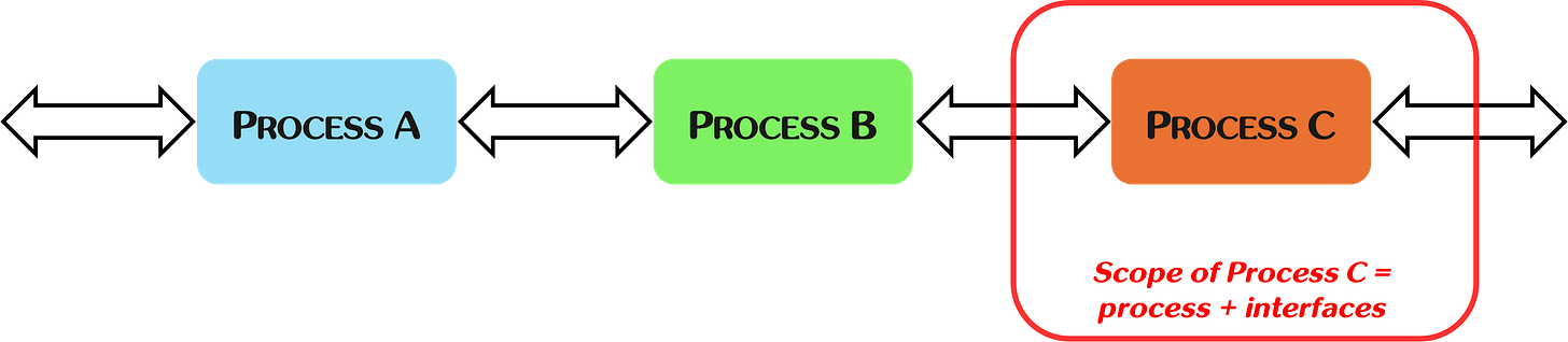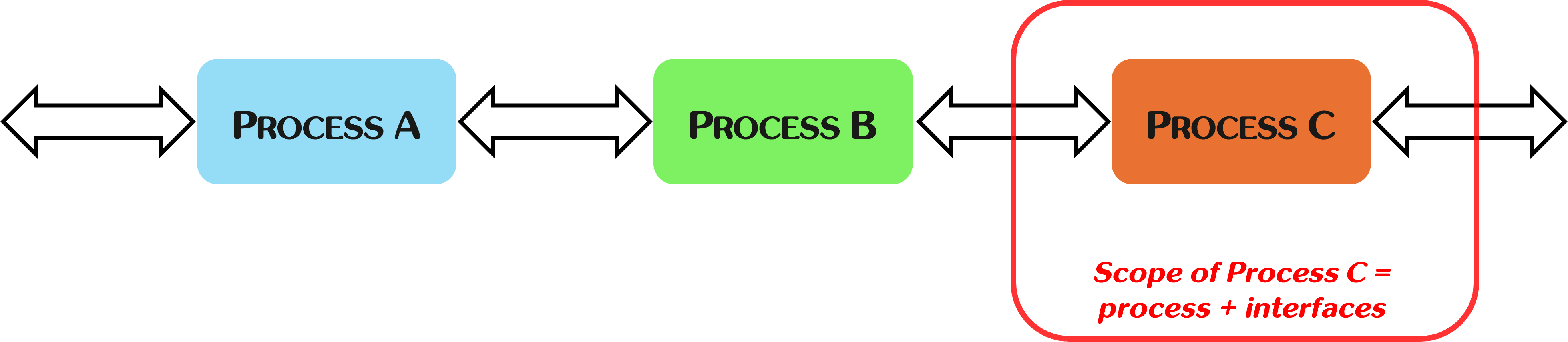 Following the same logic, we don't link multiple processes together; we only focus on our process and its interfaces. For instance, if stakeholder requirements go through Process A, then Process B, and finally reach our Process C, we define only the link between Process B and Process C. The interface between Process A and Process B is out of Process C's scope or mandate and, therefore, shouldn’t be included in the process description.